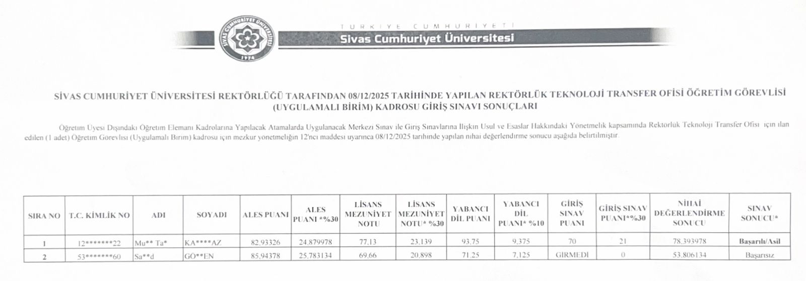 Rektörlük Teknoloji Transfer Ofisi (Uygulamalı Birim) Öğretim Elemanı alımına ilişkin nihai değerlendirme sonuçları için TIKLAYINIZ.