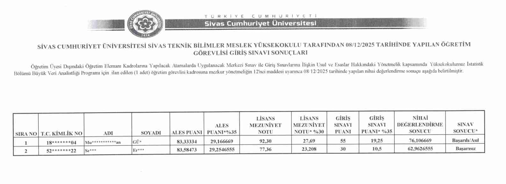 Sivas Teknik Bilimler Meslek Yüksekokulu İstatistik Bölümü Büyük Veri Analistliği Programı Öğretim Görevlisi nihai değerlendirme sonuçları için TIKLAYINIZ.