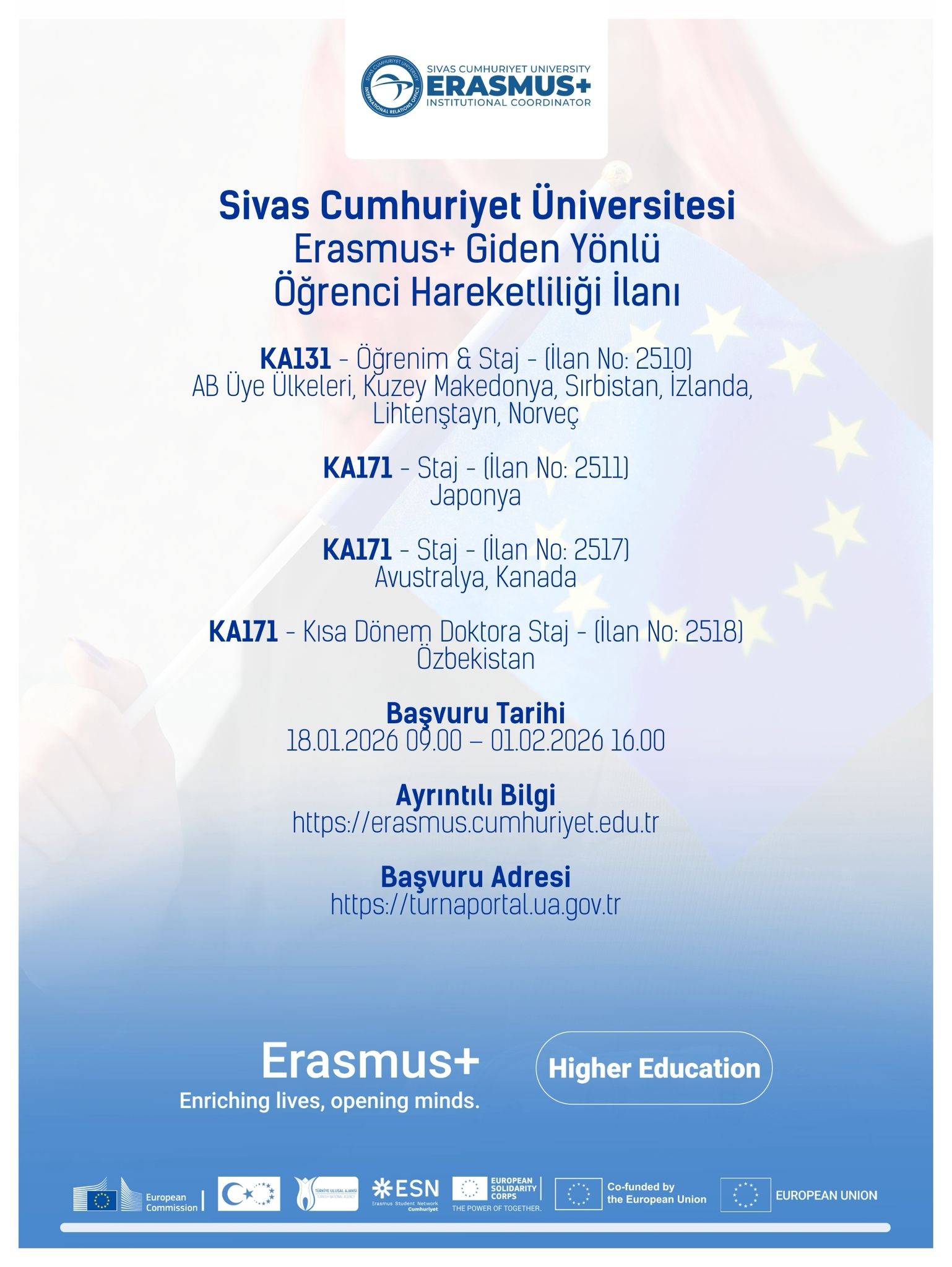 2025 Yılı Erasmus+ Öğrenci Hareketliliği İlanları Detaylı Bilgi İçin TIKLAYINIZ. Duyurular Başlama Tarihi : 30 Aralık 2025 Duyurular Bitiş Tarihi : 1 Şubat 2026