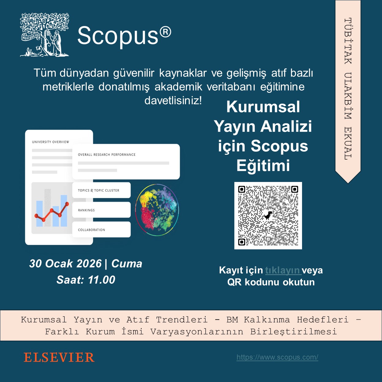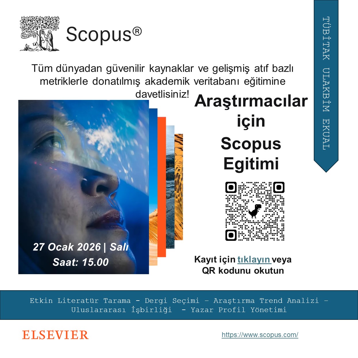 Tüm dünyadan güvenilir kaynaklar ve gelişmiş atıf bazlı metriklerle donatılmış akademik veritabanı eğitimlerine davetlisiniz. TÜBİTAK ULAKBİM EKUAL Projesi kapsamındaki Scopus, Türkiye’deki tüm üniversite ve bazı araştırma kuruluşlarına sağlanmaktadır.