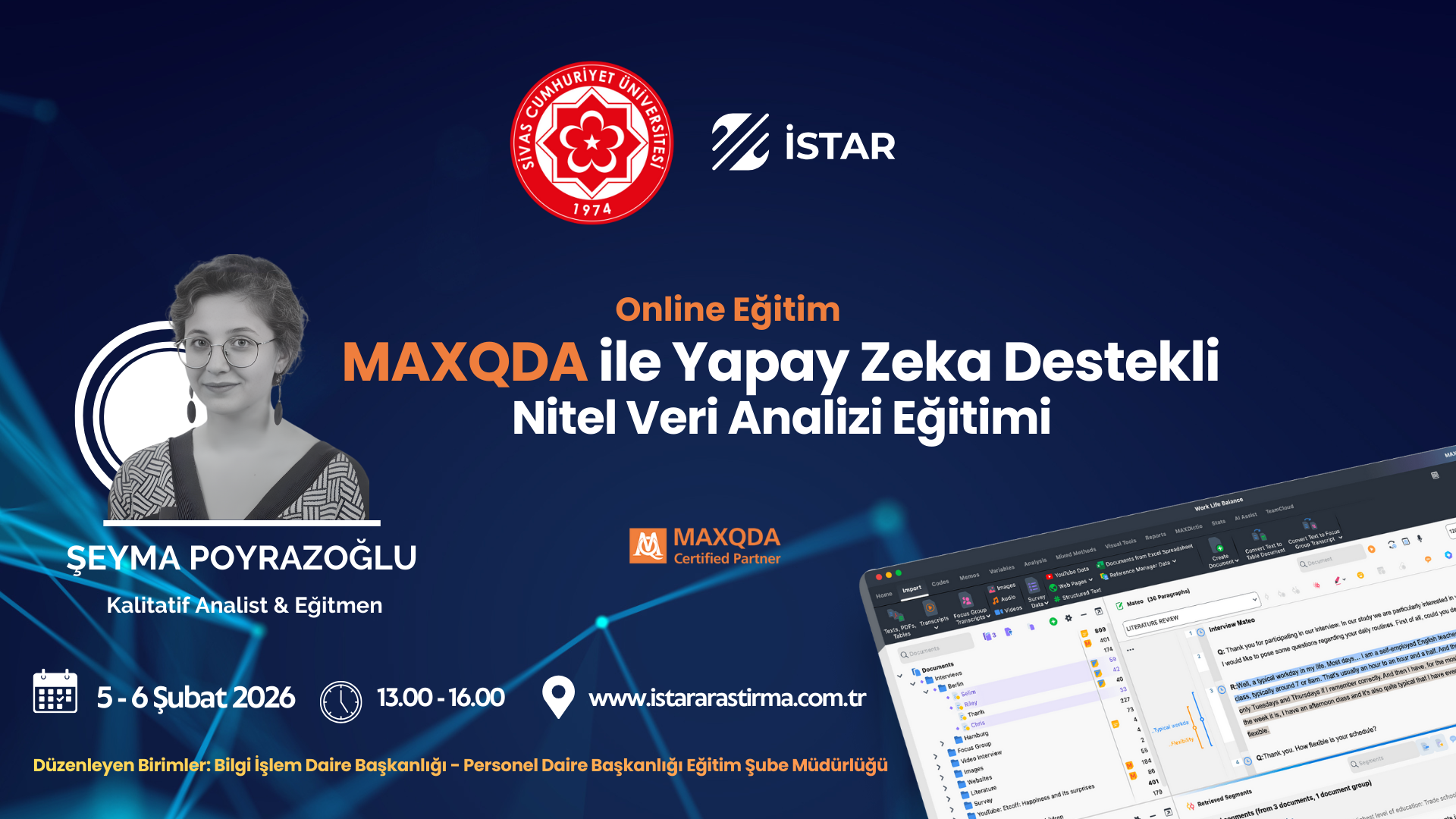 5 - 6 Şubat 2026 Perşembe ve Cuma günleri, saat 13.00 – 16.00 arasında toplam 6 saatlik çevrimiçi “MAXQDA ile Yapay Zeka Destekli Nitel Veri Analizi Eğitimi” gerçekleştirilecektir.