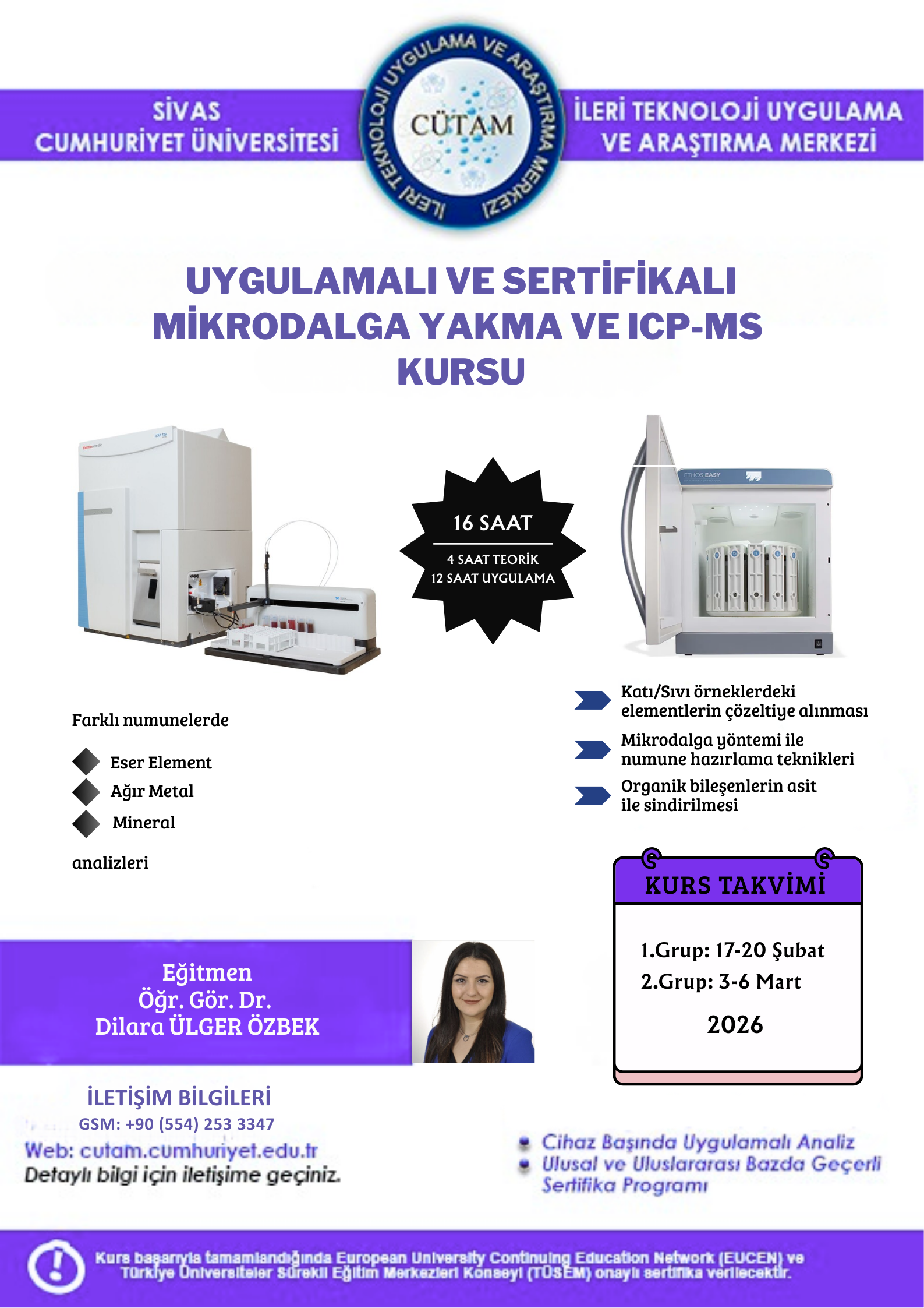 Uygulamalı ve Sertifikalı Mikrodalga Yakma ve ICP-MS Kursu Duyurular Başlama Tarihi : 5 Şubat 2026 Duyurular Bitiş Tarihi : 6 Mart 2026