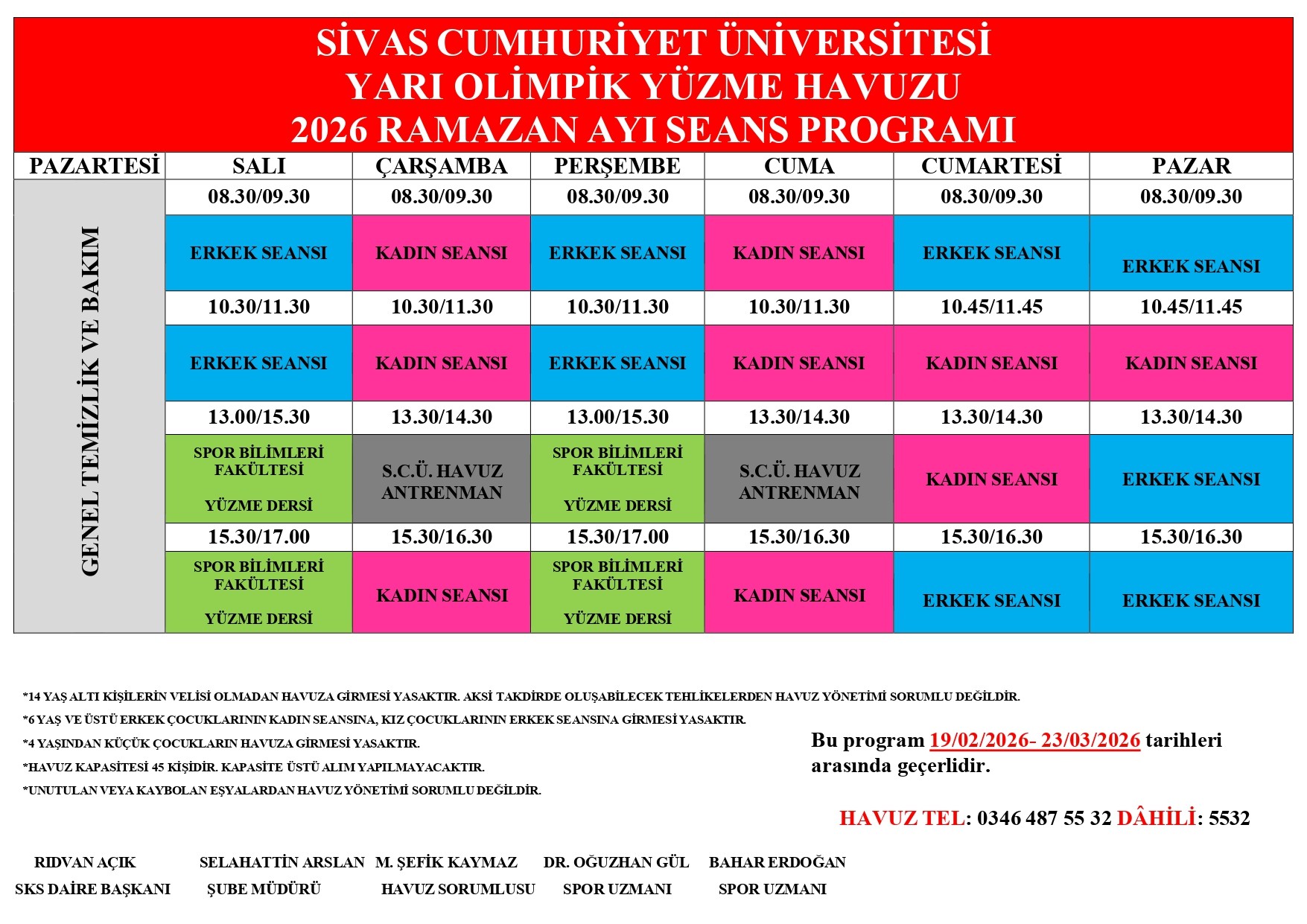 Yarı Olimpik Yüzme Havuzu 2026 Ramazan Ayı Seans Programı Duyurular Başlama Tarihi : 17 Şubat 2026 Duyurular Bitiş Tarihi : 24 Şubat 2026