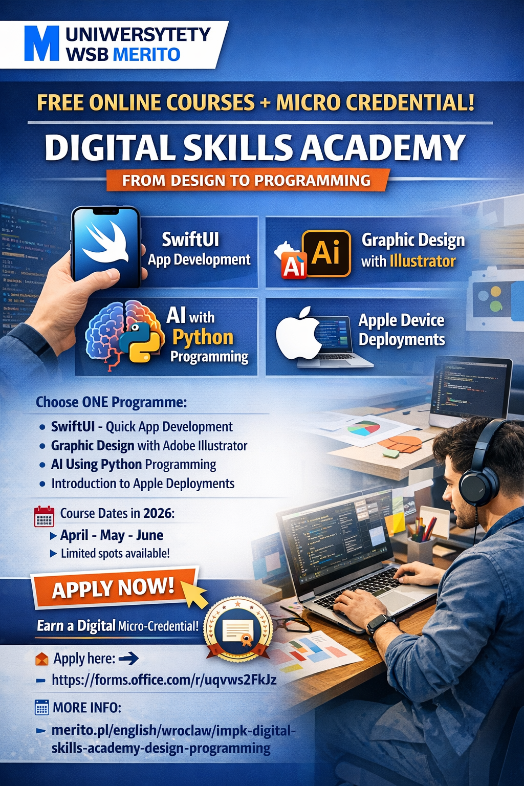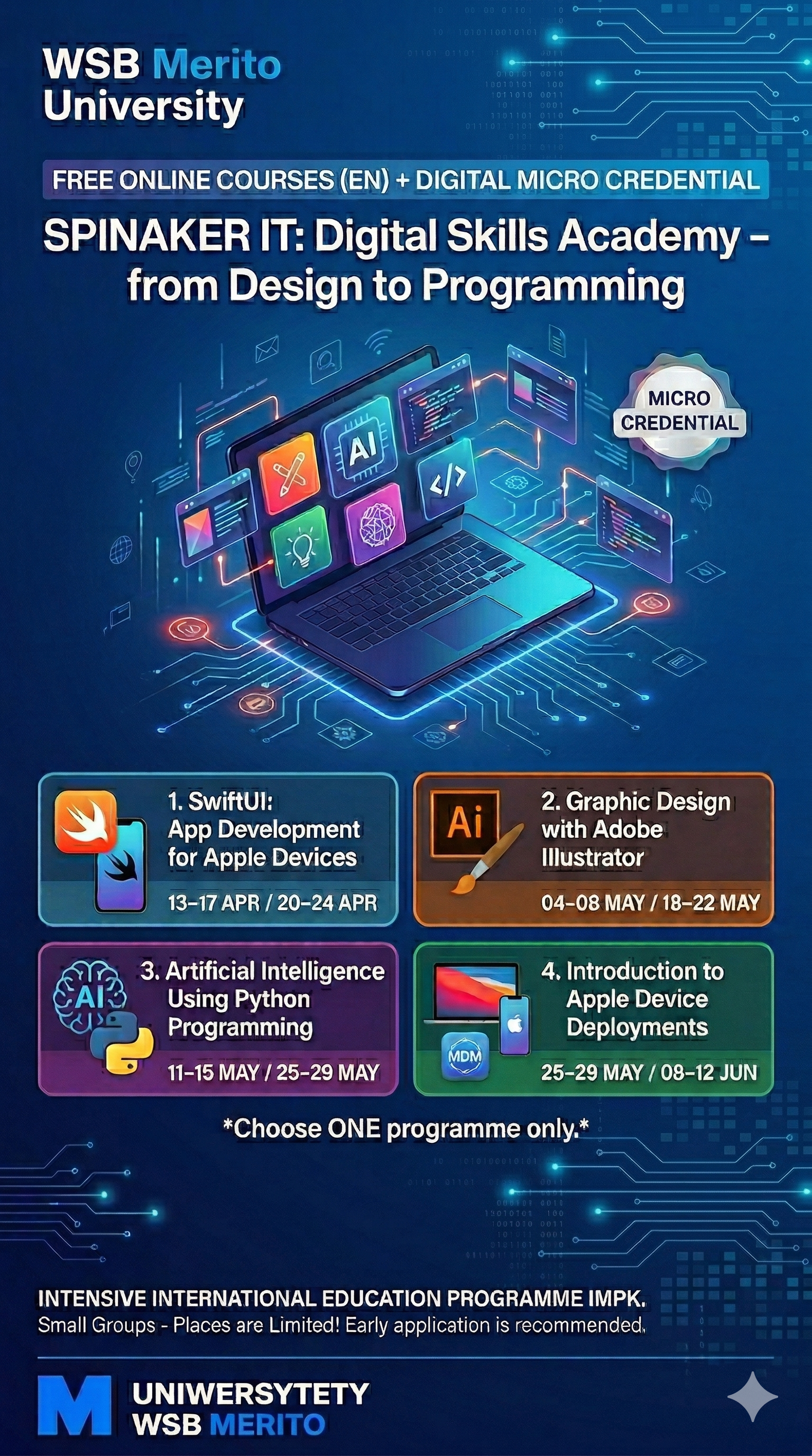 WSB Merito University tarafından düzenlenen SPINAKER IT: “Digital Skills Academy – From Design to Programming” programına katılım başvuruları açılmıştır.