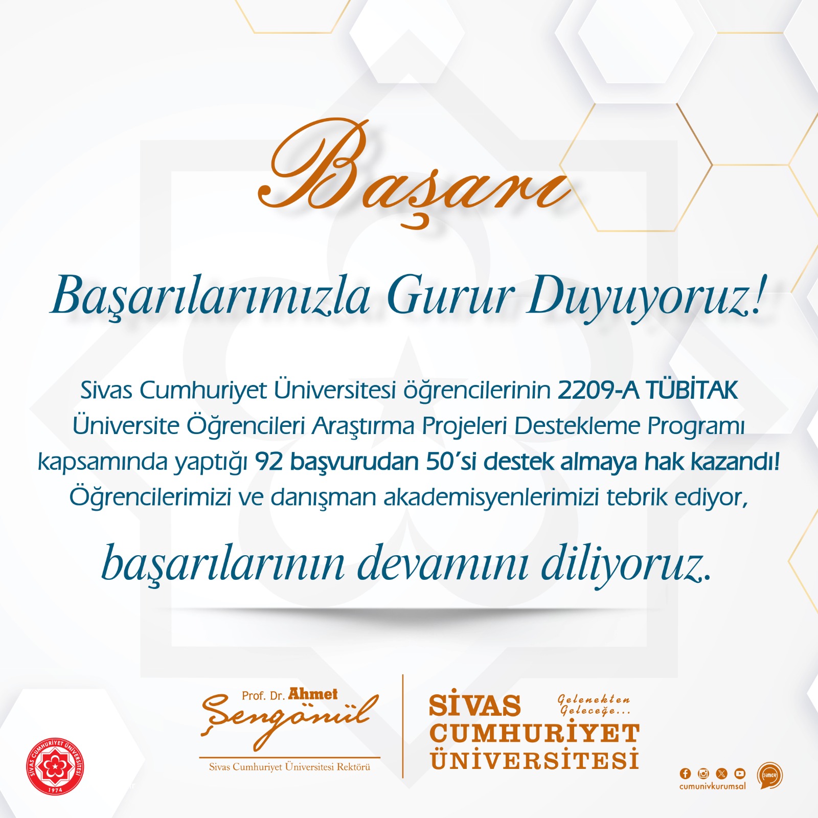 Sivas Cumhuriyet Üniversitesi olarak öğrencilerimizi ve danışman öğretim üyelerimizi tebrik ediyor, bilimsel araştırmalar yoluyla ülkemizin geleceğine katkı sunmaya devam edeceklerine yürekten inanıyoruz.