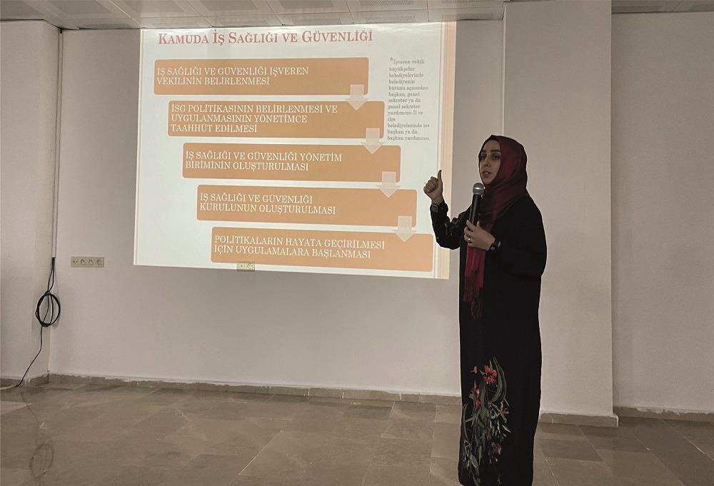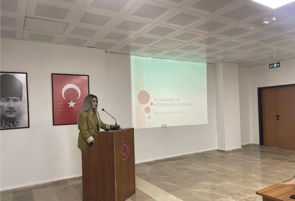 Panelde Üniversitemiz İş Sağlığı ve Güvenliği Birimi Koordinatörü Öğr. Gör. Nihan Ümit Yıldız, dünyada ve ülkemizde iş sağlığının gelişimi, 6331 sayılı İş Sağlığı ve Güvenliği Kanununun kapsamı, iş kazaları ile ilgili istatistiki bilgi ve alınması gereken önlemler gibi konularda öğrencilere açıklamalarda bulundu. Ayrıca Öğr. Gör. Nihan Ümit Yıldız alanda yaşadığı örnek olaylar hakkında bilgi vererek, mesleki anlamda yapılması gereken konulara değindi.
