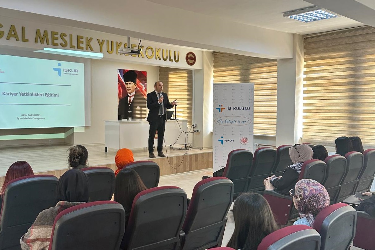 Kangal MYO’da, Sivas İŞKUR iş birliğiyle düzenlenen “İş Kulübü Eğitimleri” programında, İş ve Meslek Danışmanı Akın Sarıgüzel tarafından öğrenciler için işgücü piyasasına hazırlık eğitimi verildi. Konferans salonunda gerçekleşen etkinlikte, kendini tanıma, özgeçmiş hazırlama, iş arama kanalları ve mülakat teknikleri gibi konularda pratik bilgiler aktarıldı. Eğitim, öğrencilerin kariyer planlamalarına katkı sağlamayı amaçladı.
