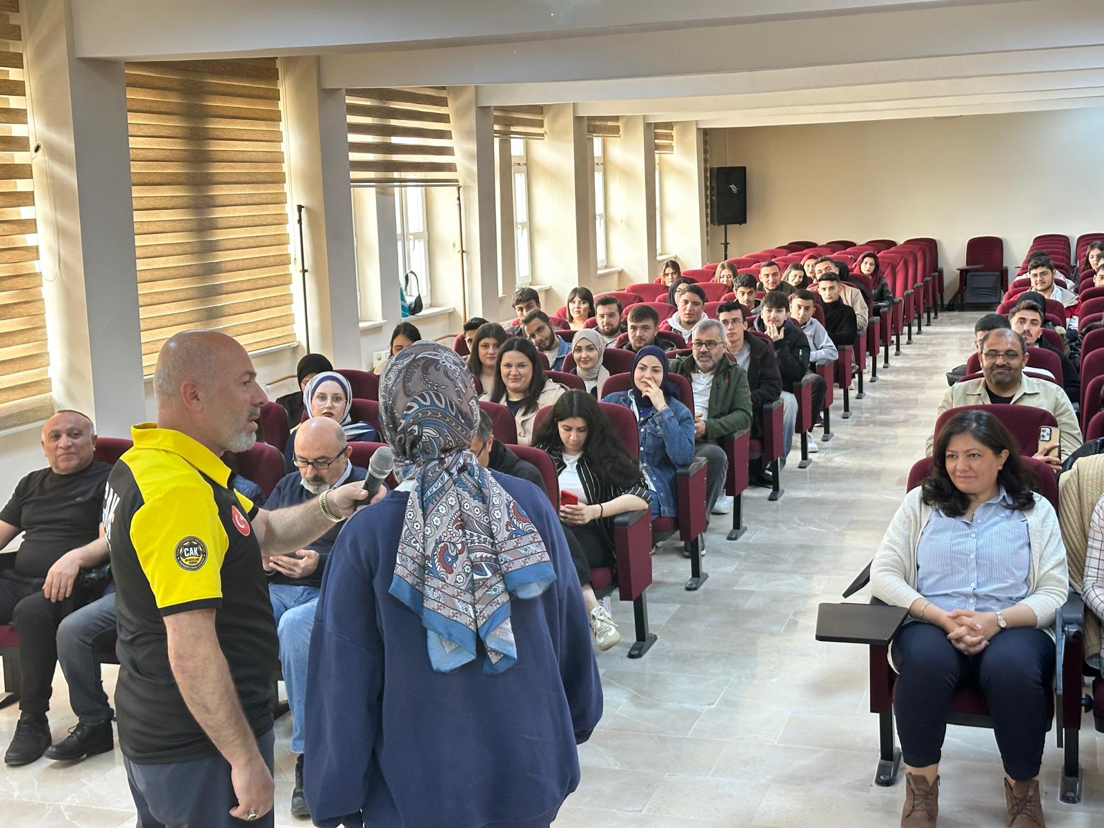 Sivas Cumhuriyet Üniversitesi Cumhuriyet Arama ve Kurtarma Birimi (CAK) tarafından yürütülen “Afete Hazır Üniversite” projesi kapsamında, Kangal MYO öğrencilerine “Afet Bilinci Farkındalık Eğitimi” düzenlendi. CAK Birim Sorumlusu Öğr. Gör. Kemal Demetçiçek tarafından verilen eğitimde, öğrencilerin afetlere karşı bilinç düzeyinin artırılması ve acil durumlara hazırlıklı olmaları hedeflendi. Eğitim, temel afet bilgileri ve hazırlık süreçlerini kapsadı.