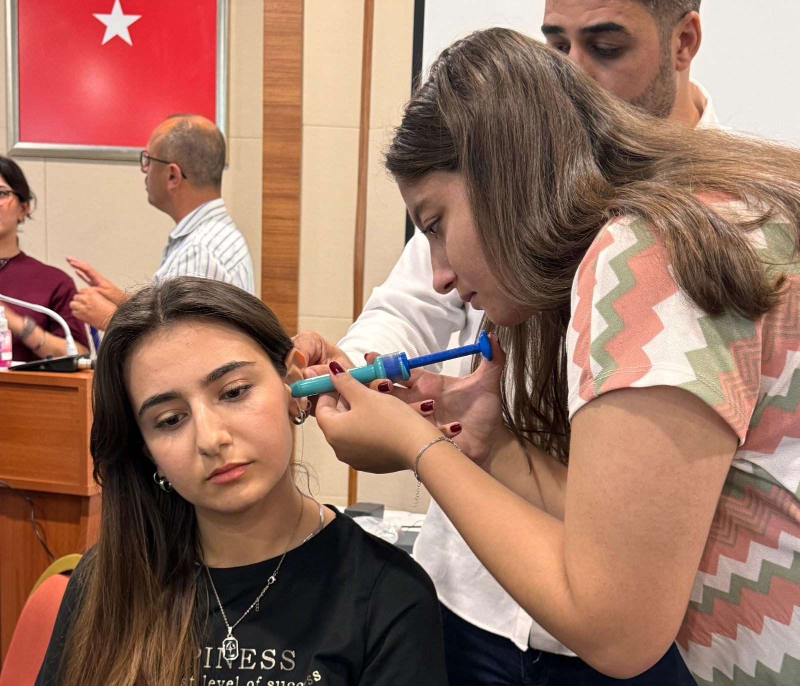Öğr. Gör. Rumeysa Coşkun Göçer ve Öğr. Gör. Melek Kekül Şapcı koordinasyonunda düzenlenen seminerde, işitme cihazları çalışma prensipleri, bireye özel ayarlama süreçleri ve güncel teknolojiye sahip cihaz yazılımları üzerine kapsamlı sunumlar gerçekleşirken uygulama oturumlarında işitme cihazı fittingi, Gerçek Kulak Ölçümü (Real Ear Measurement) uygulaması ve kulak izi alma eğitimi gerçekleştirildi. Bu uygulamalar sayesinde öğrenciler, klinik ortamlarda karşılaşabilecekleri işlemleri yakından gözlemleme ve birebir deneyimleme fırsatı buldu.