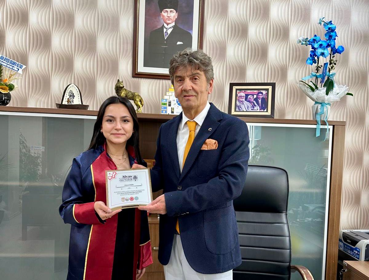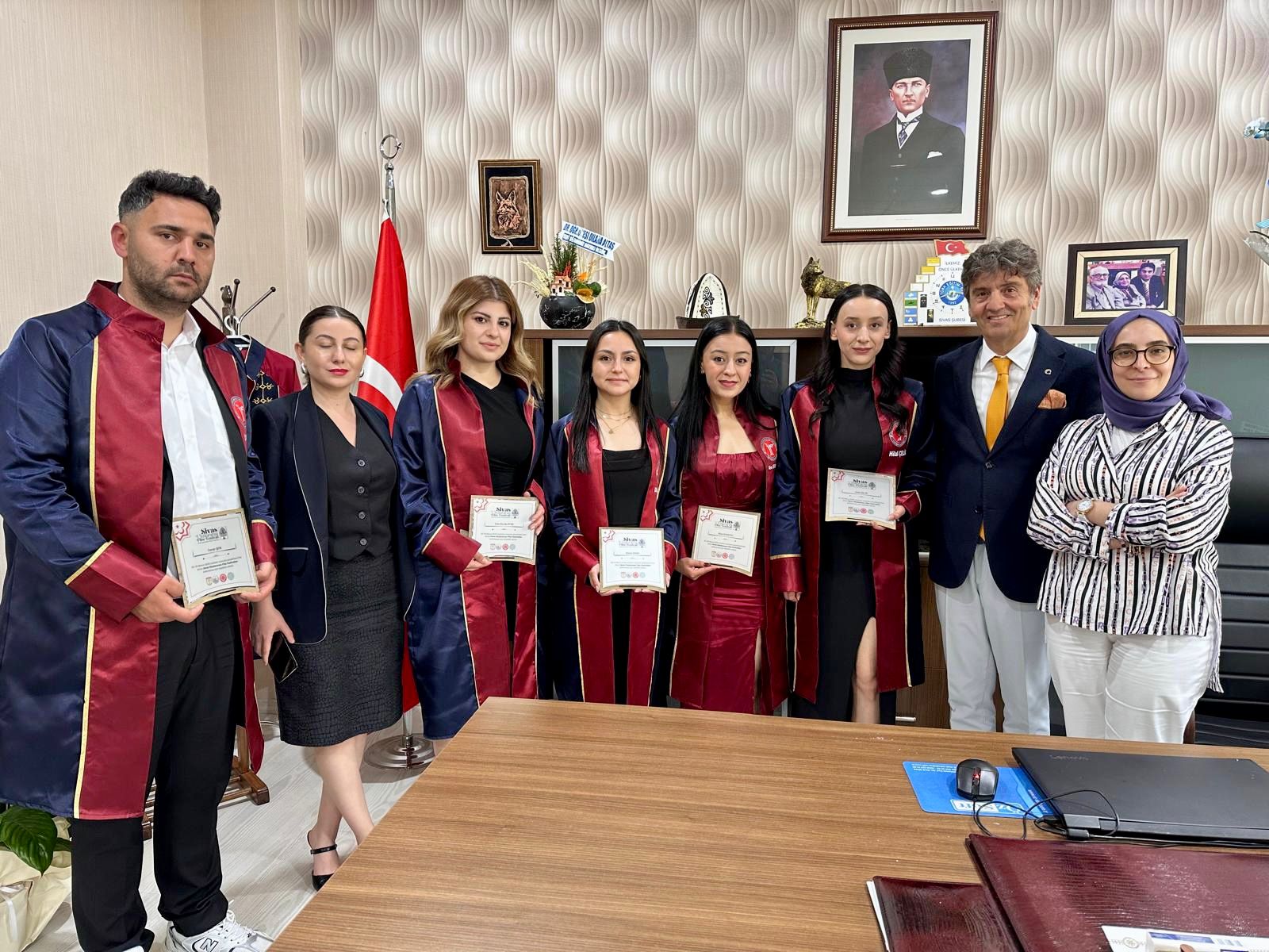 İletişim Fakültesi öğrencileri Caner Şen, Dilara Eken, Eda Gözde Ateş, Gizem Altuntaş, Hilal Çelik ve Nisa Subatay belgelerini Doç. Dr. Nevzat Balıkçıoğlu’ndan aldılar.