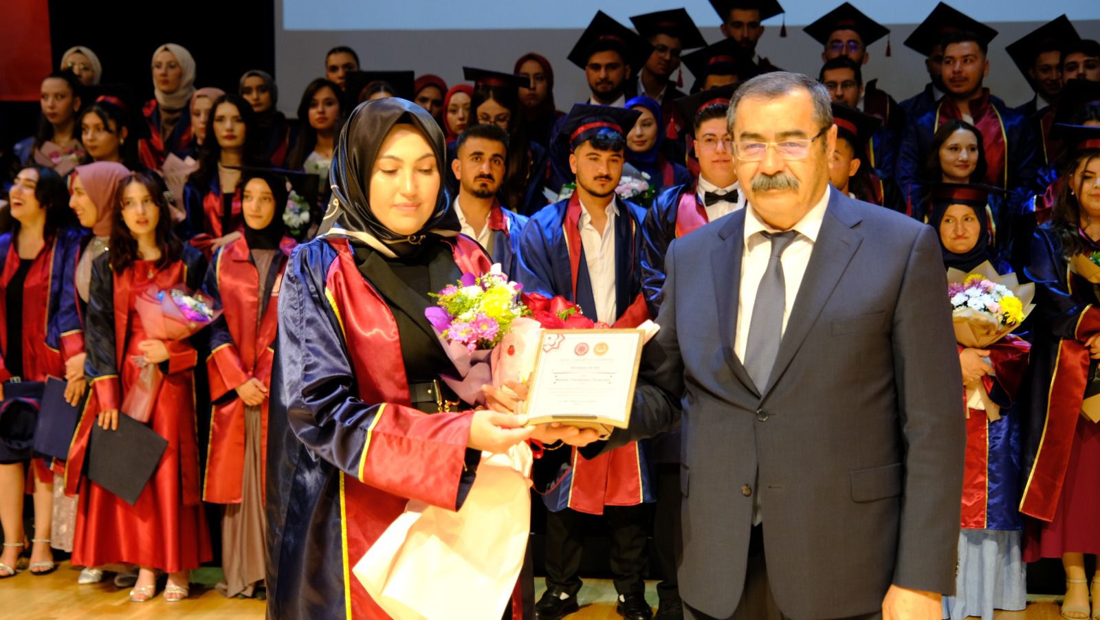 Yüksekokul Müdürü Dr. Öğr. Üyesi Şimşek ise yaptığı konuşmada, mezun olan öğrencilerin sadece alanlarında uzman bireyler olmakla kalmayıp aynı zamanda sorumluluk sahibi ve topluma faydalı bireyler olarak yetiştiklerini vurguladı. Tüm mezunlara sağlık, mutluluk ve başarı dolu bir gelecek temennisinde bulundu.