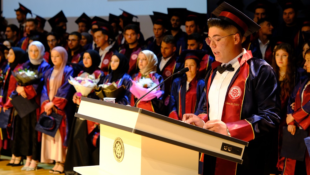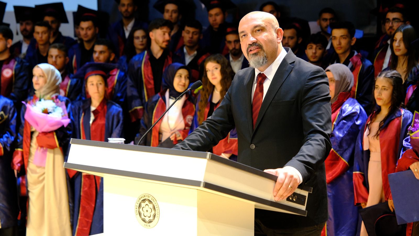 Rektör Yardımcısı Prof. Dr. İnan törende gerçekleştirdiği konuşmada, “Öğrencilerimiz, ülkemizin ihtiyaç duyduğu birçok önemli alanda eğitimlerini tamamladılar. Üniversiteler, yalnızca akademik bilgi sunan yapılar olmanın ötesinde; bireylerin kendilerini tanıdığı, hayata dair beceriler kazandığı, çok yönlü gelişim alanlarıdır. Öğrencilerimiz mesleki donanımlarının ötesinde, araştırma becerisi kazanmış; sorgulayan, farklı düşünme yollarını benimseyen ve sorunlara yapıcı çözümler üretebilen bireyler olarak mezun oldular.