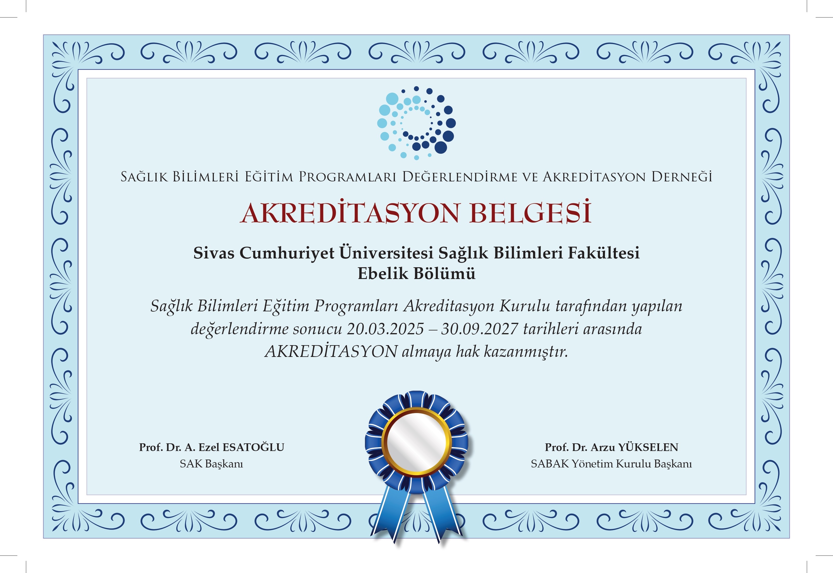 Sivas Cumhuriyet Üniversitesi Sağlık Bilimleri Fakültesi Ebelik Bölümü, Sağlık Bilimleri Eğitim Programları Değerlendirme ve Akreditasyon Derneği (SABAK) tarafından gerçekleştirilen titiz bir değerlendirme süreci sonucunda, 20 Mart 2025 – 30 Eylül 2027 tarihleri arasında geçerli olacak şekilde yeniden akreditasyon almaya hak kazandı.