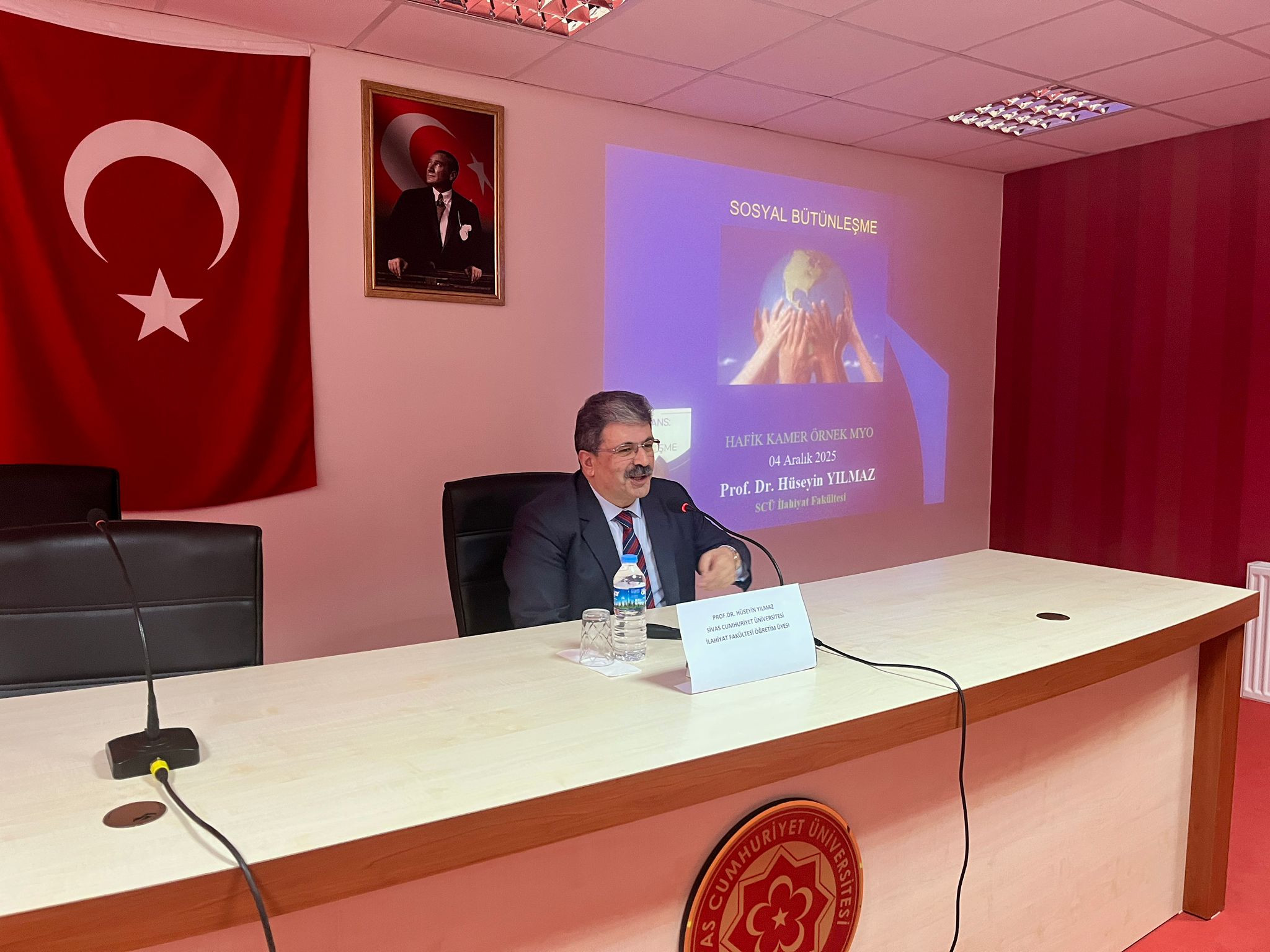 Sivas Cumhuriyet Üniversitesi İlahiyat Fakültesi akademisyenlerinden Prof. Dr. Hüseyin Yılmaz, Hafik Kamer Örnek Meslek Yüksekokulu Genç Girişimciler Öğrenci Kulübü tarafından düzenlenen “Sosyal Bütünleşme” konulu konferansta öğrencilerle bir araya geldi.