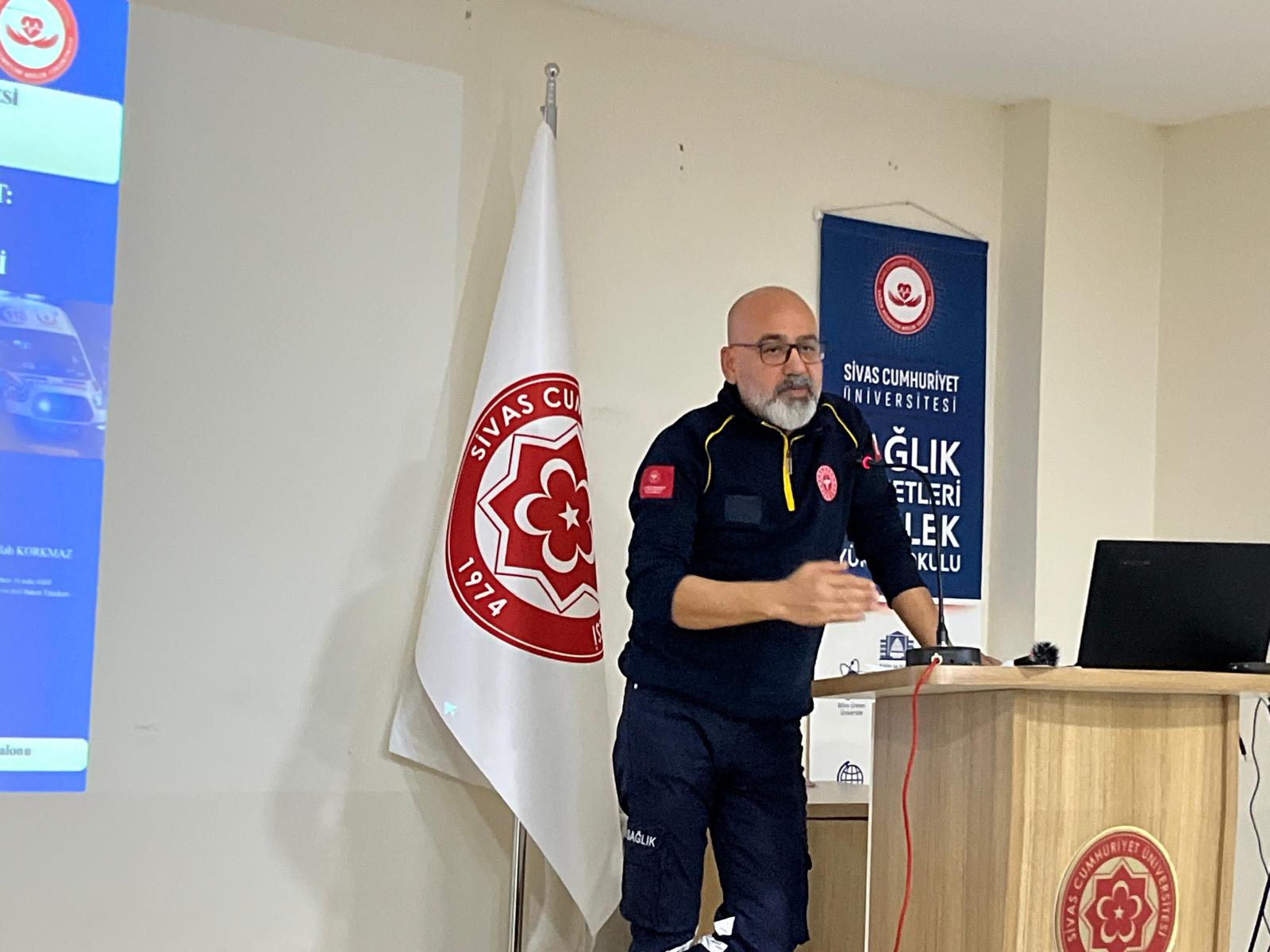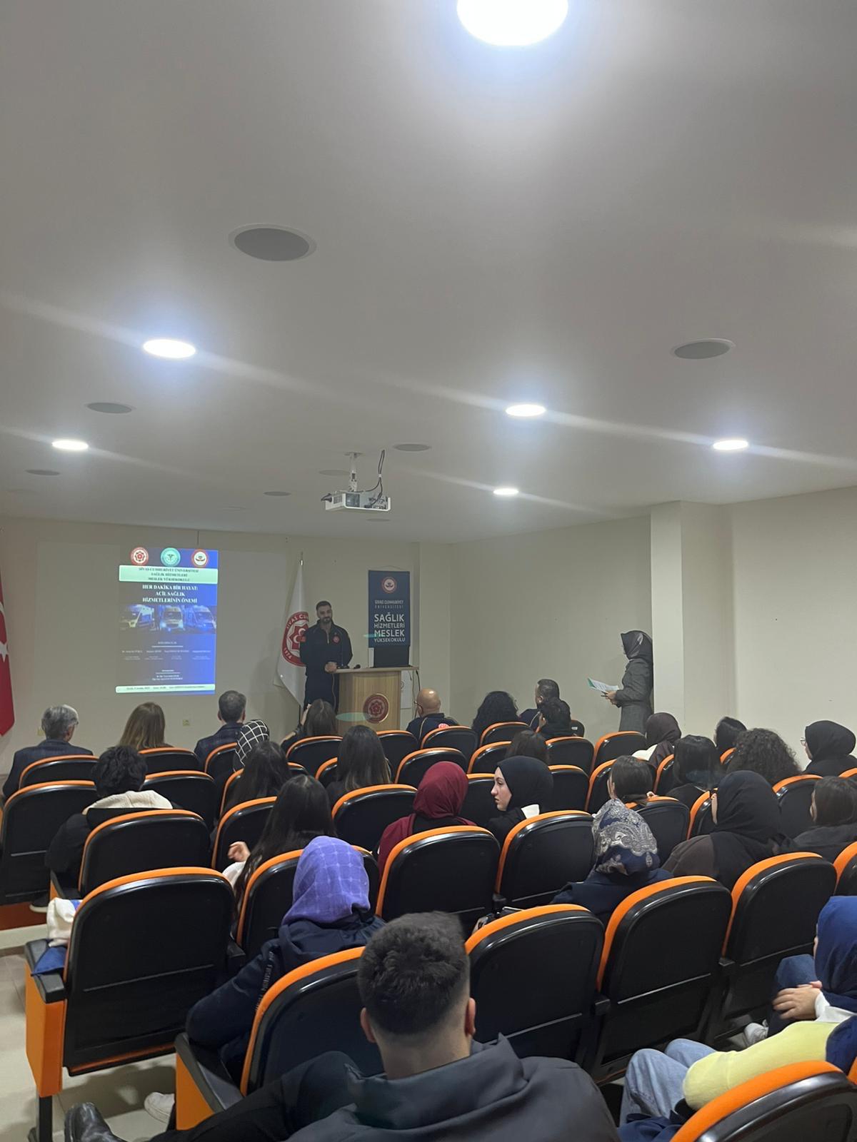 SHMYO Konferans Salonu’nda yoğun katılımla gerçekleştirilen programda acil durum yönetimi, 112 çağrı süreçleri, vakaya ulaşma süresinin hayati rolü ve personelin görev bilincinin önemi vurgulandı.