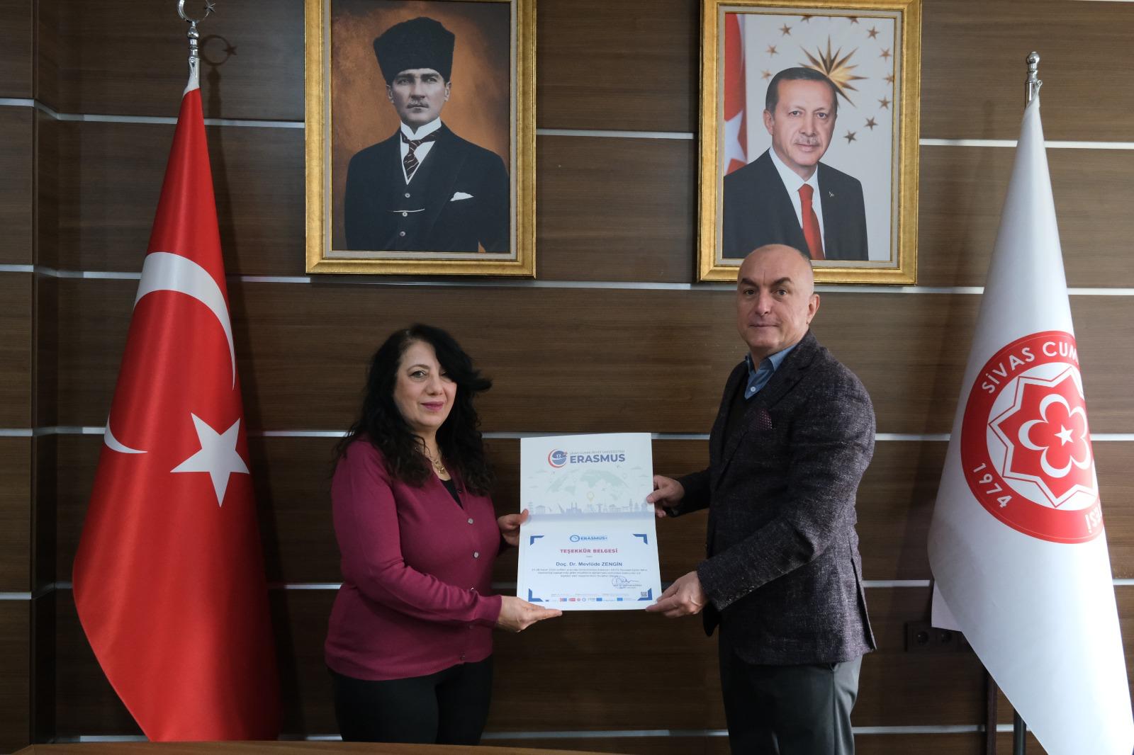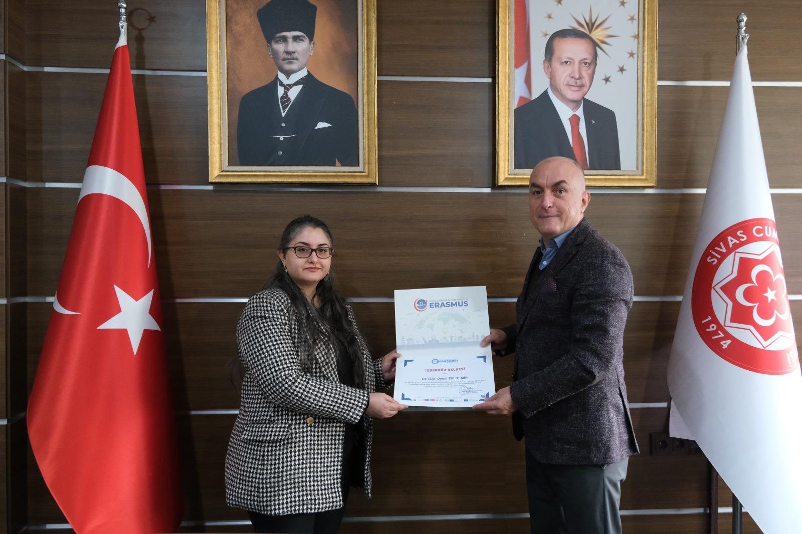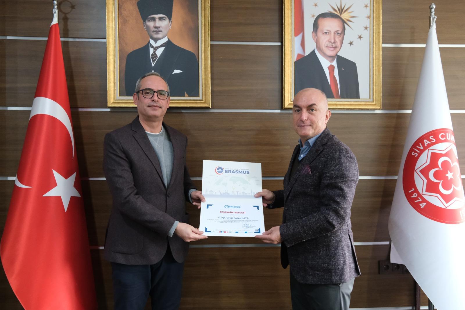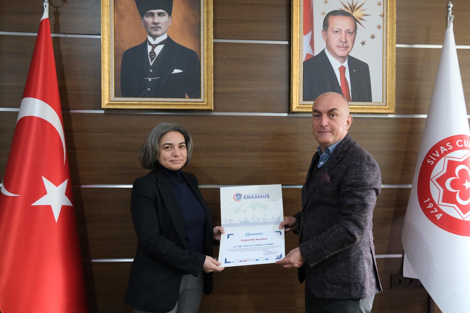 Programın sonunda, hareketliliğin gerçekleştirilmesine katkı sunan Edebiyat Fakültesi İngiliz Dili ve Edebiyatı Bölümü öğretim elemanlarına teşekkür belgeleri, Üniversitemiz Rektör Yardımcısı ve Uluslararası İlişkiler Ofisi Başkanı Prof. Dr. Süleyman Değirmen tarafından takdim edildi.