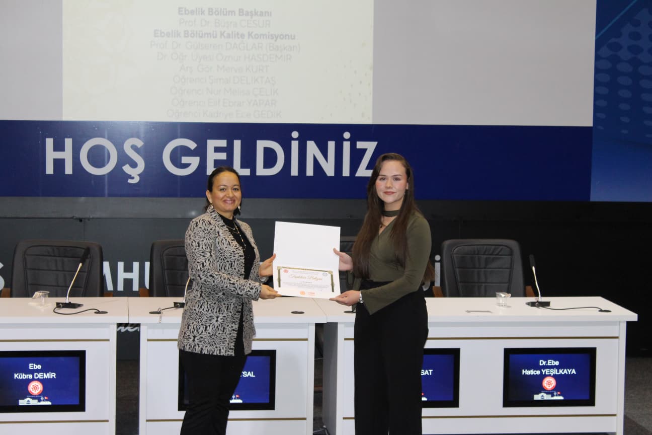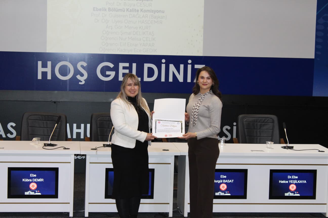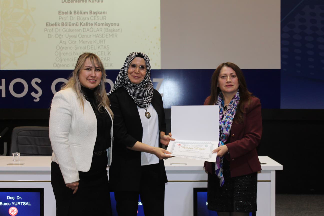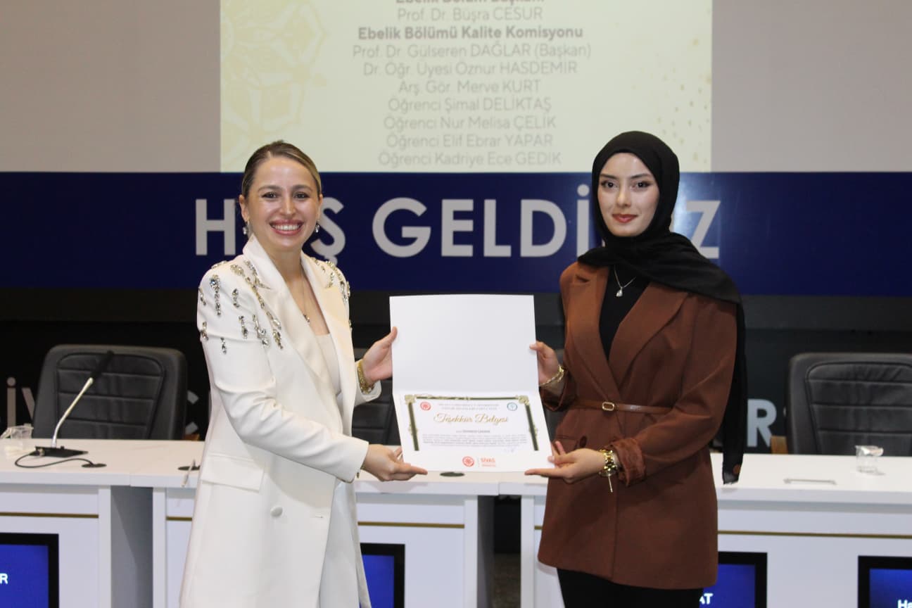 Gerçekleştirilen “Biz Birlikte Güçlüyüz: Teşekkür Belgesi Takdim Töreni”nde ise Ebelik Bölümü öğretim elemanlarına eğitim-öğretim ve akademik süreçlerdeki özverili katkılarından dolayı teşekkür belgeleri sunuldu. Bölüm Başkanı Prof. Dr. Büşra Cesur’a, bölümün akademik ve kurumsal gelişimine sağladığı katkılar nedeniyle Sağlık Bilimleri Fakültesi Dekanı Prof. Dr. Selma Sabancıoğulları tarafından teşekkür belgesi verildi. Ayrıca Ebelik Öğrenci Kulübü ve komisyonlarda aktif görev alan öğrencilere de belgeler takdim edilerek bölüm içi dayanışma ve aidiyet duygusu pekiştirildi.