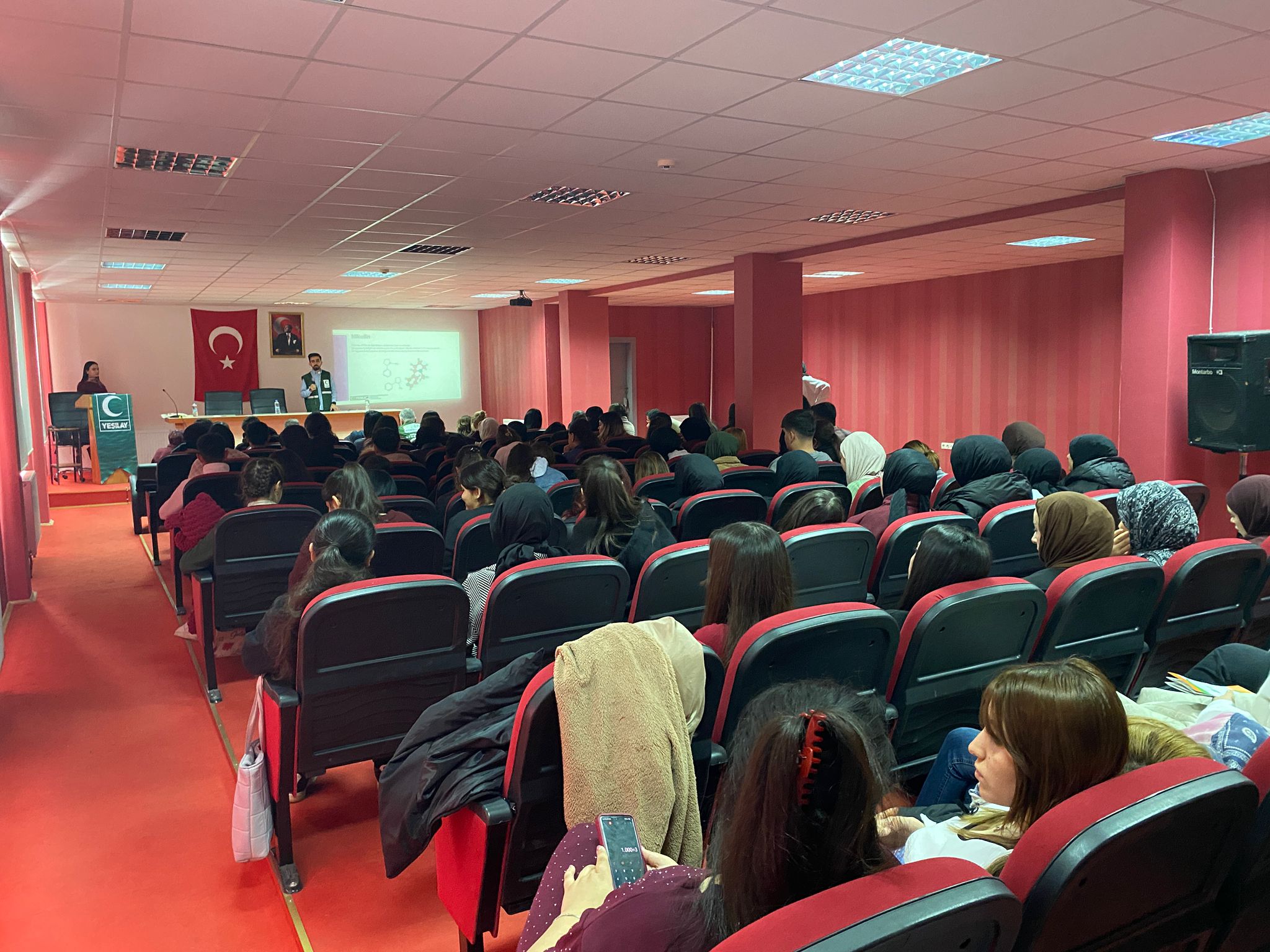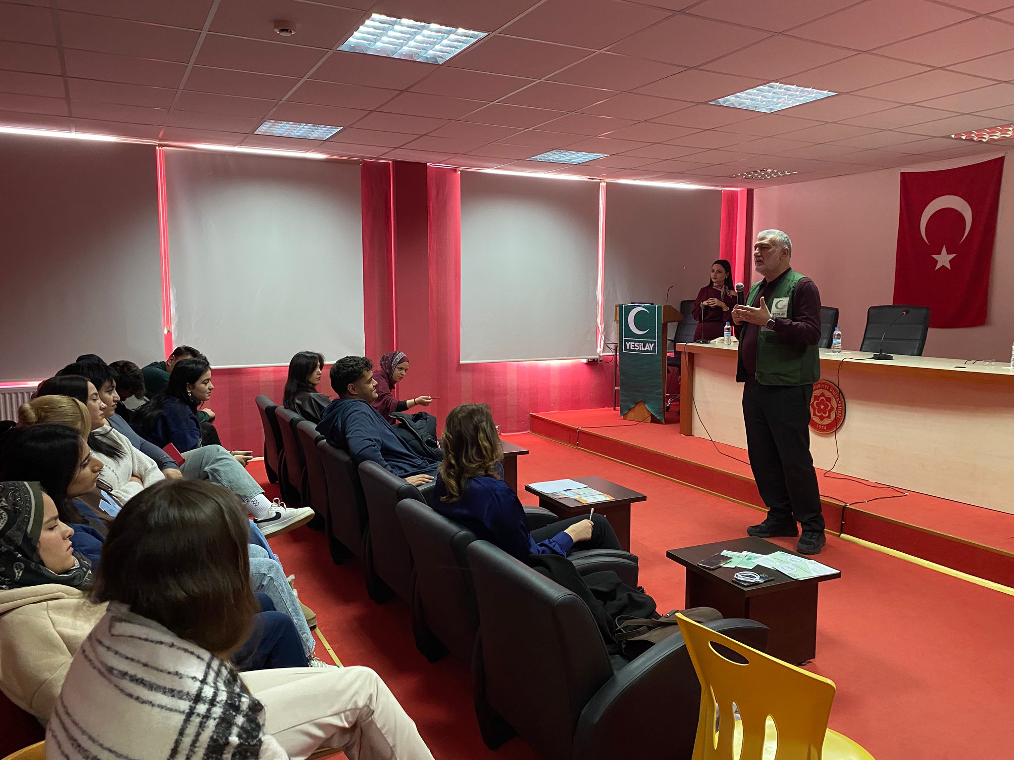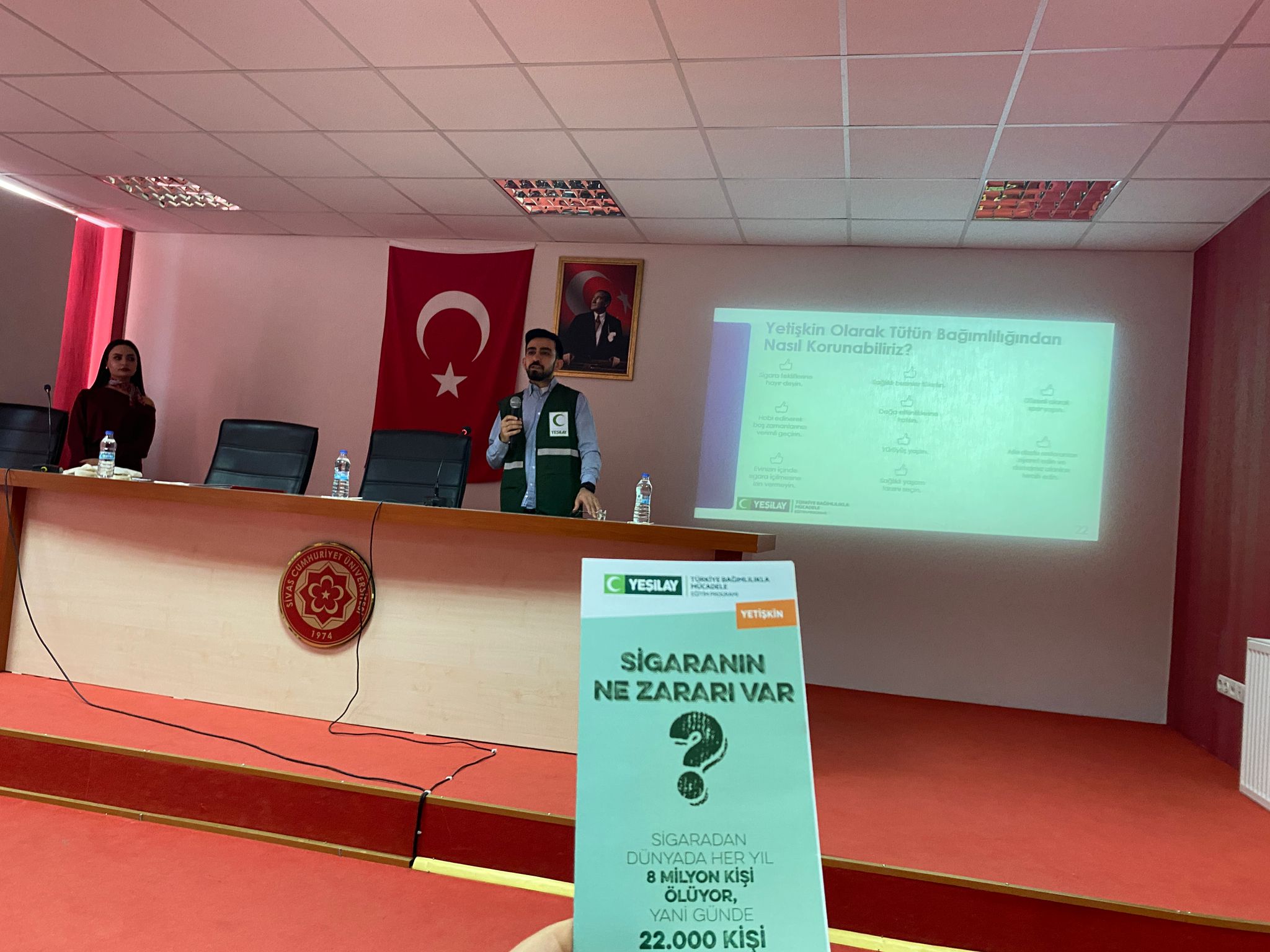 Dr. Öğr. Üyesi Bahar Türkmenoğlu tarafından düzenlenen “Bağımlılıkla Mücadele” seminerinde; Yeşilay Sivas Şube Başkanı Halit Köksal ve Akran Eğitmeni Mehmet Öztürk konuşmacı olarak yer aldı. Madde bağımlılığı, tütün ve alkol kullanımı, davranışsal bağımlılıklar ile bireysel ve toplumsal sorumluluklar ele alındı. Gençlerin bilinçlendirilmesi, akran desteğinin önemi ve Yeşilay’ın çalışmaları vurgulandı. Program, soru-cevap bölümü ve teşekkür belgelerinin takdimiyle sona erdi.