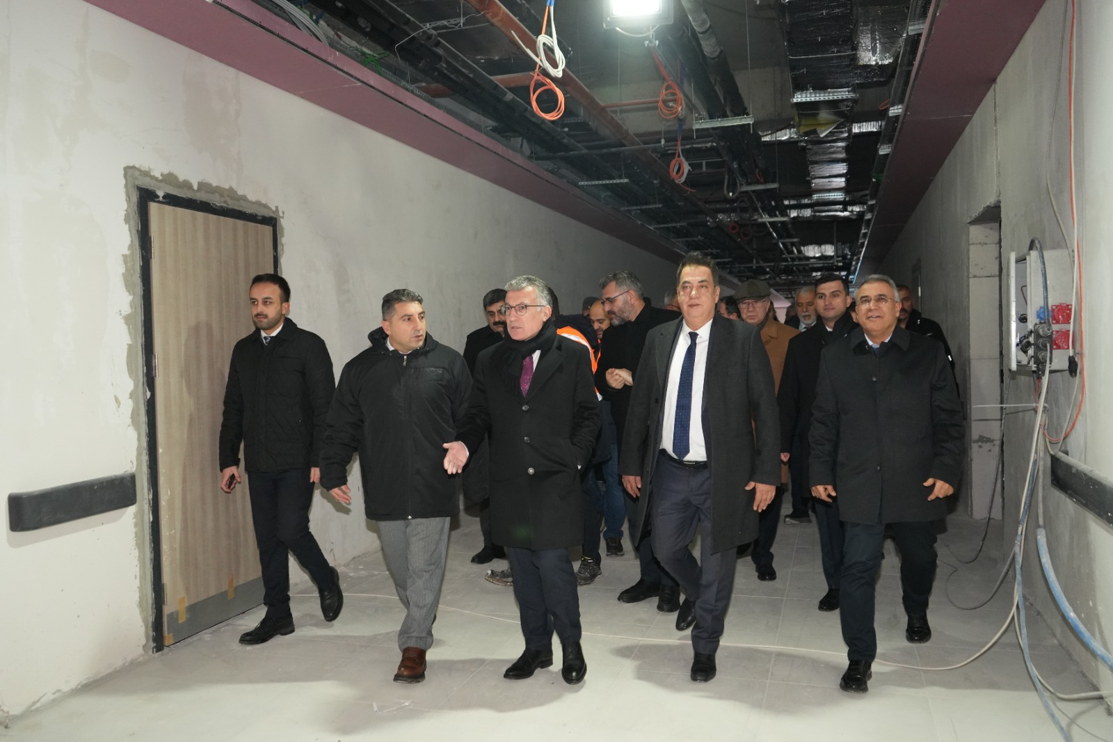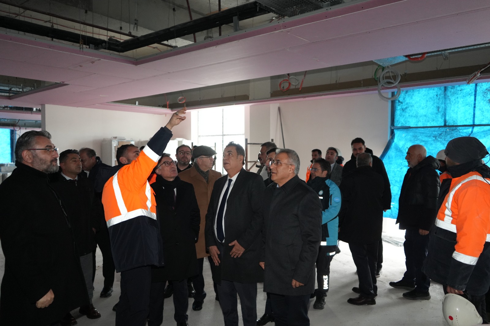 İncelemeler sırasında hastane inşaatının mevcut durumu hakkında yetkililerden bilgi alan heyet, yürütülen çalışmalar ile inşaatın ilerleme sürecine ilişkin değerlendirmelerde bulundu.