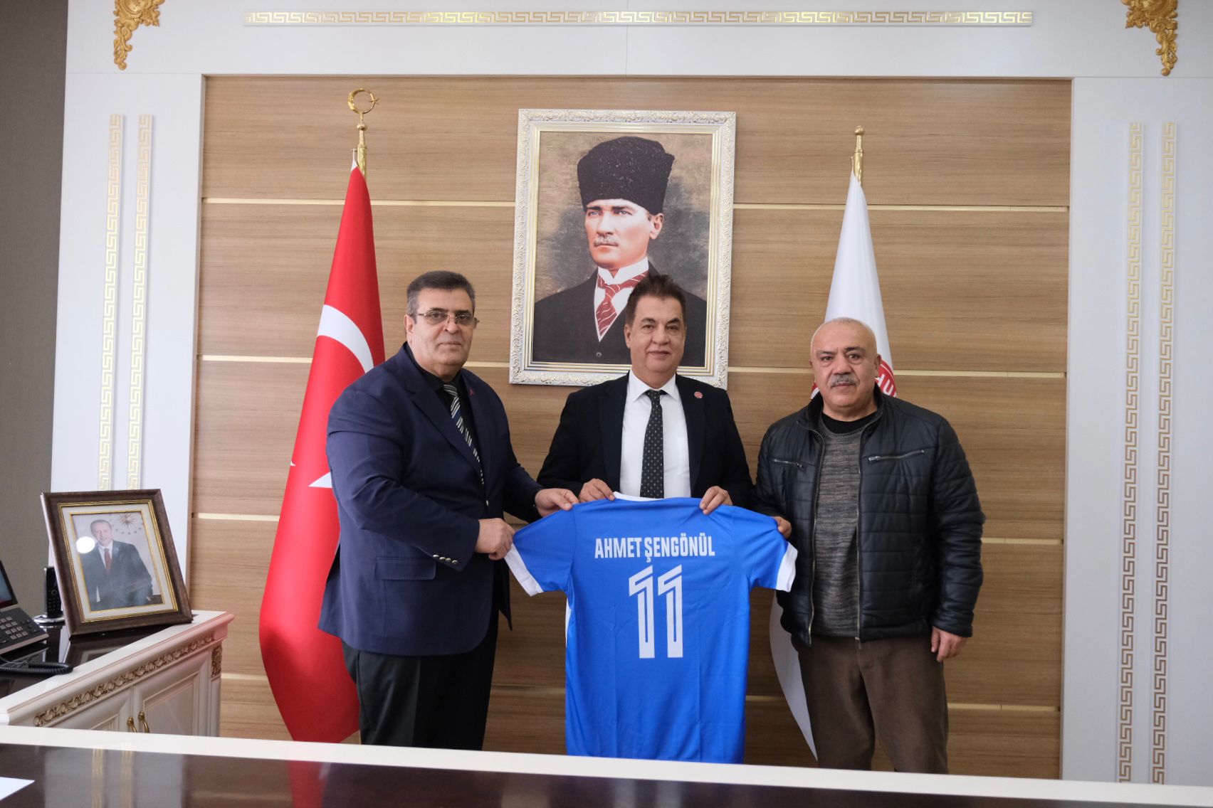 Ziyaret sonunda Kulüp Başkanı Muzaffer Işıklar ve Teknik Direktör Metin Özkoçak tarafından Rektörümüz Prof. Dr. Ahmet Şengönül’e forma takdim edildi.
