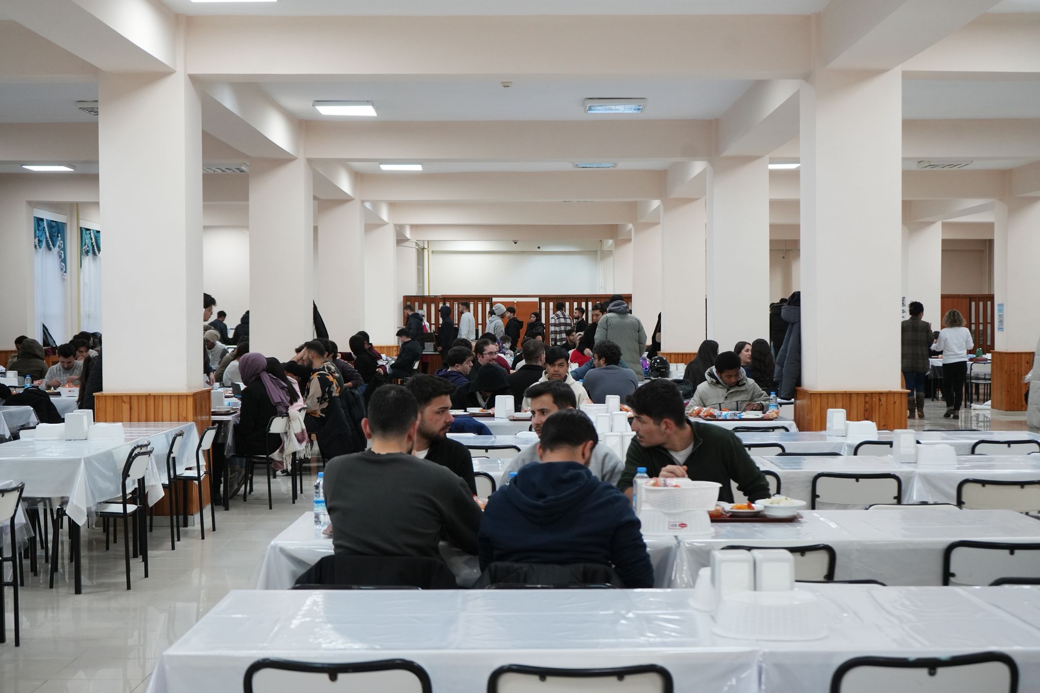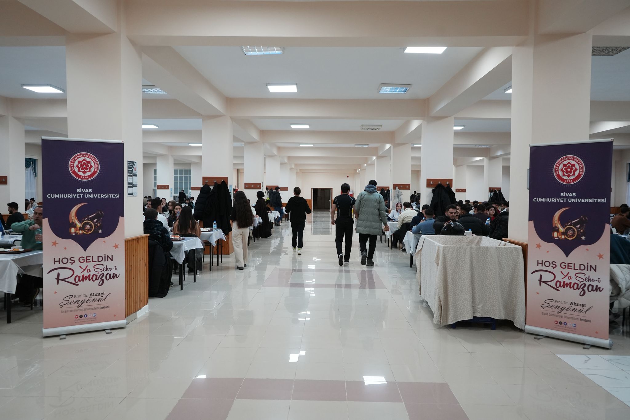 Sivas Cumhuriyet Üniversitesi öğrenci yemekhanesinde gerçekleşen iftarda üniversite yöneticileri, yemek dağıtımına eşlik ederek öğrencilerle aynı sofrayı paylaştı.