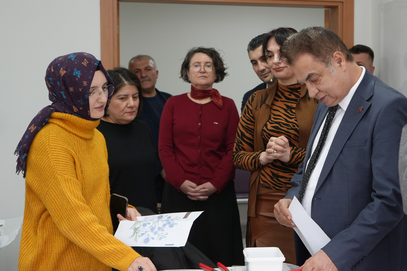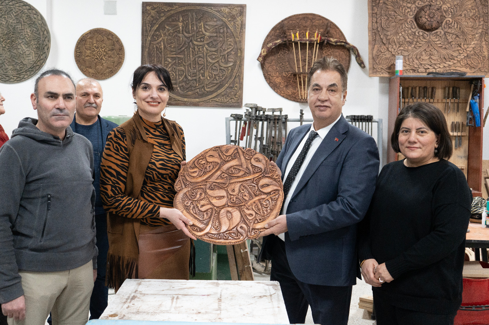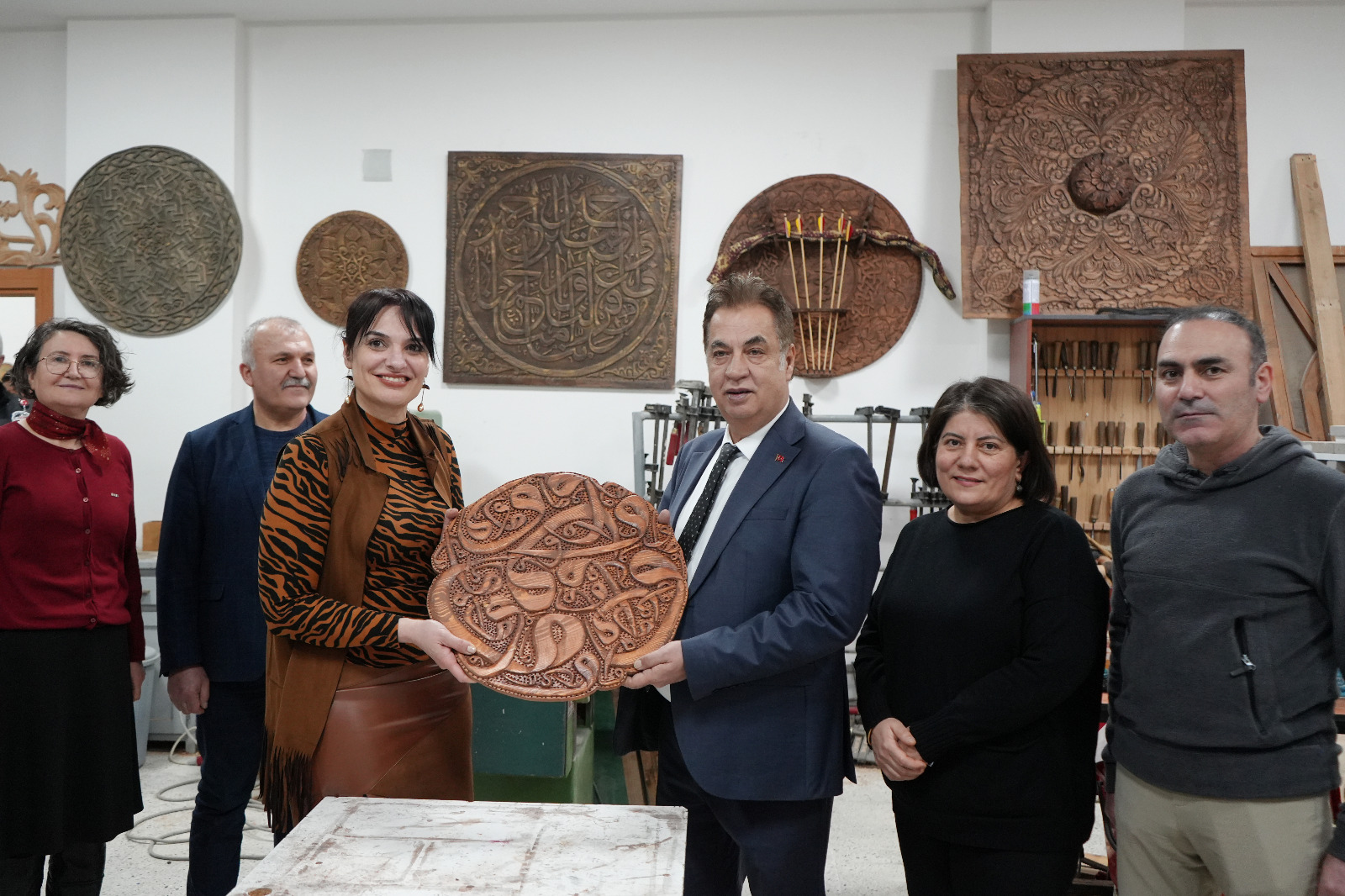 Ziyaret kapsamında El Sanatları Bölümüne ait Duvar Süsleme, Dokuma, Seramik, El Sanatları, Ahşap Teknikleri ve Halı Dokuma atölyelerini gezen Rektörümüz Prof. Dr. Ahmet Şengönül’e, atölyelerde yürütülen çalışmalar hakkında Sivas Teknik Bilimler Meslek Yüksekokulu Müdürü Dr. Öğr. Üyesi Selma Şimşek, bölüm başkanı ve öğretim elemanları tarafından bilgi verildi.