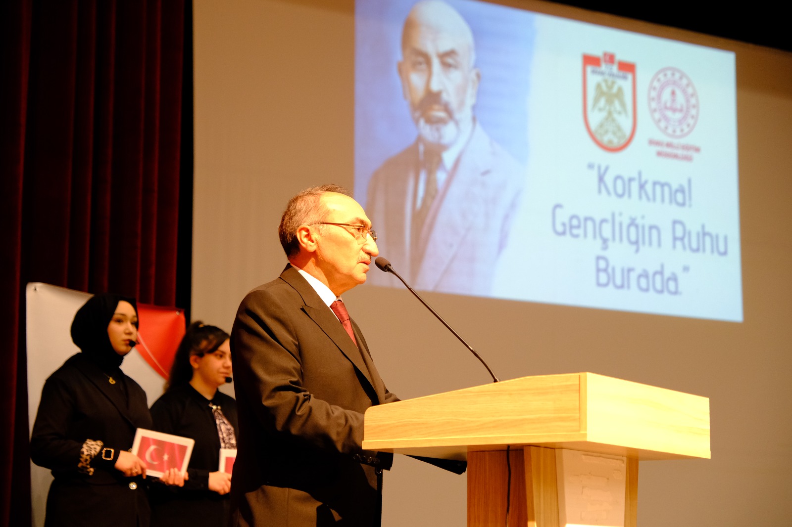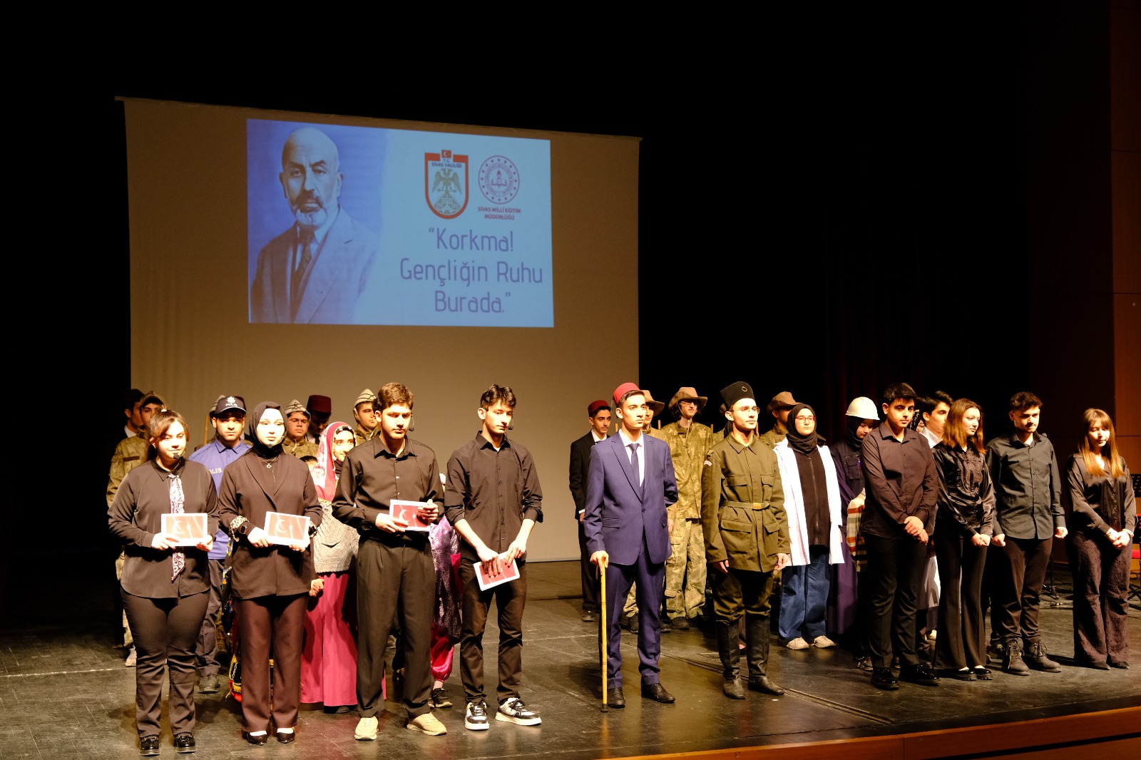 Program, saygı duruşu ve İstiklal Marşı’nın okunmasıyla başladı. Ardından Sivas İhramcızade Anadolu İmam Hatip Lisesi öğrencileri ve öğretmenleri tarafından hazırlanan “Korkma! Gençliğin Ruhu Burada” temalı gösteri sahnelendi. Gösteride, Mehmet Akif Ersoy’un vatan sevgisi, bağımsızlık mücadelesi ve İstiklal Marşı’nın yazılış süreci sahne performansıyla aktarıldı.