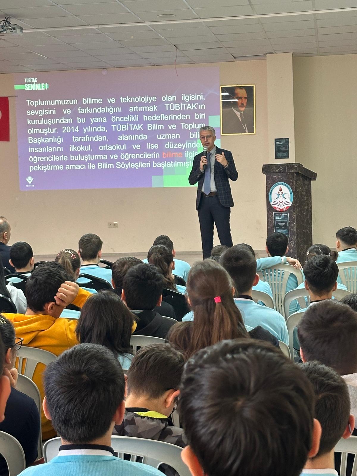 Toplumda bilime ve teknolojiye olan ilgiyi artırmayı amaçlayan TÜBİTAK Bilim Söyleşileri Programı kapsamında düzenlenen etkinlikte, yapay zekâ teknolojilerinin günümüzdeki kullanım alanları, gelecekteki potansiyeli ve günlük yaşam üzerindeki etkileri öğrencilere anlaşılır bir dille aktarıldı.