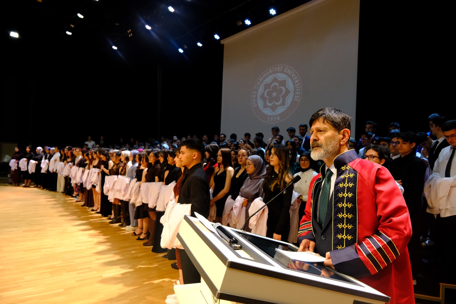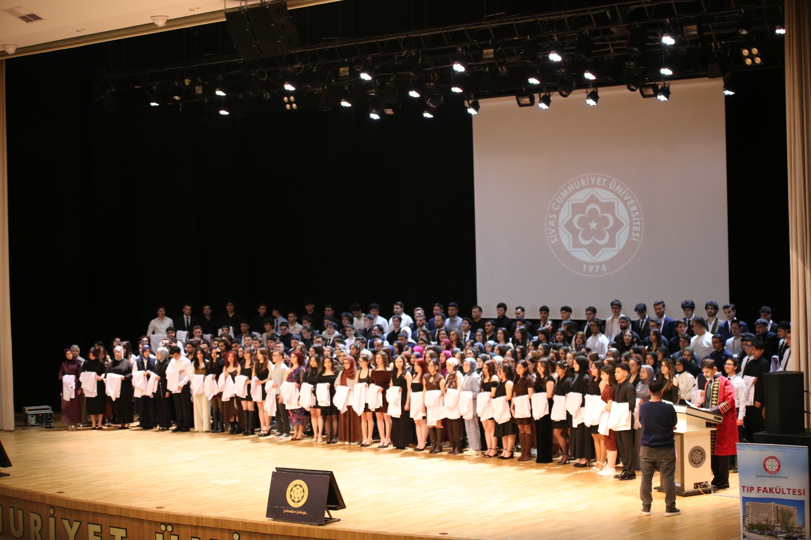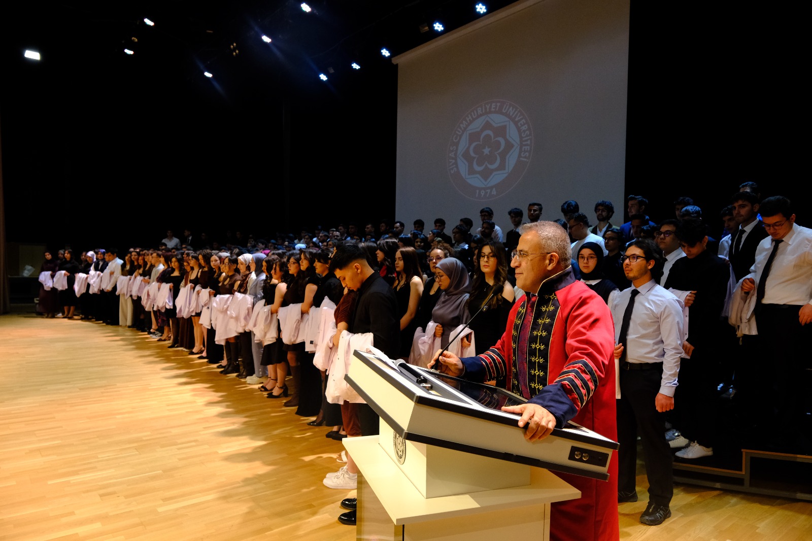 Sivas Cumhuriyet Üniversitesi olarak bizler de sağlık alanında ülkemize ve insanlığa hizmet edecek genç hekim adaylarının yetişmesine katkı sağlamaktan büyük gurur duyuyor; beyaz önlüklerini giyerek meslek yolculuklarına ilk adımlarını atan tüm öğrencilerimize başarılarla dolu bir eğitim hayatı diliyoruz.