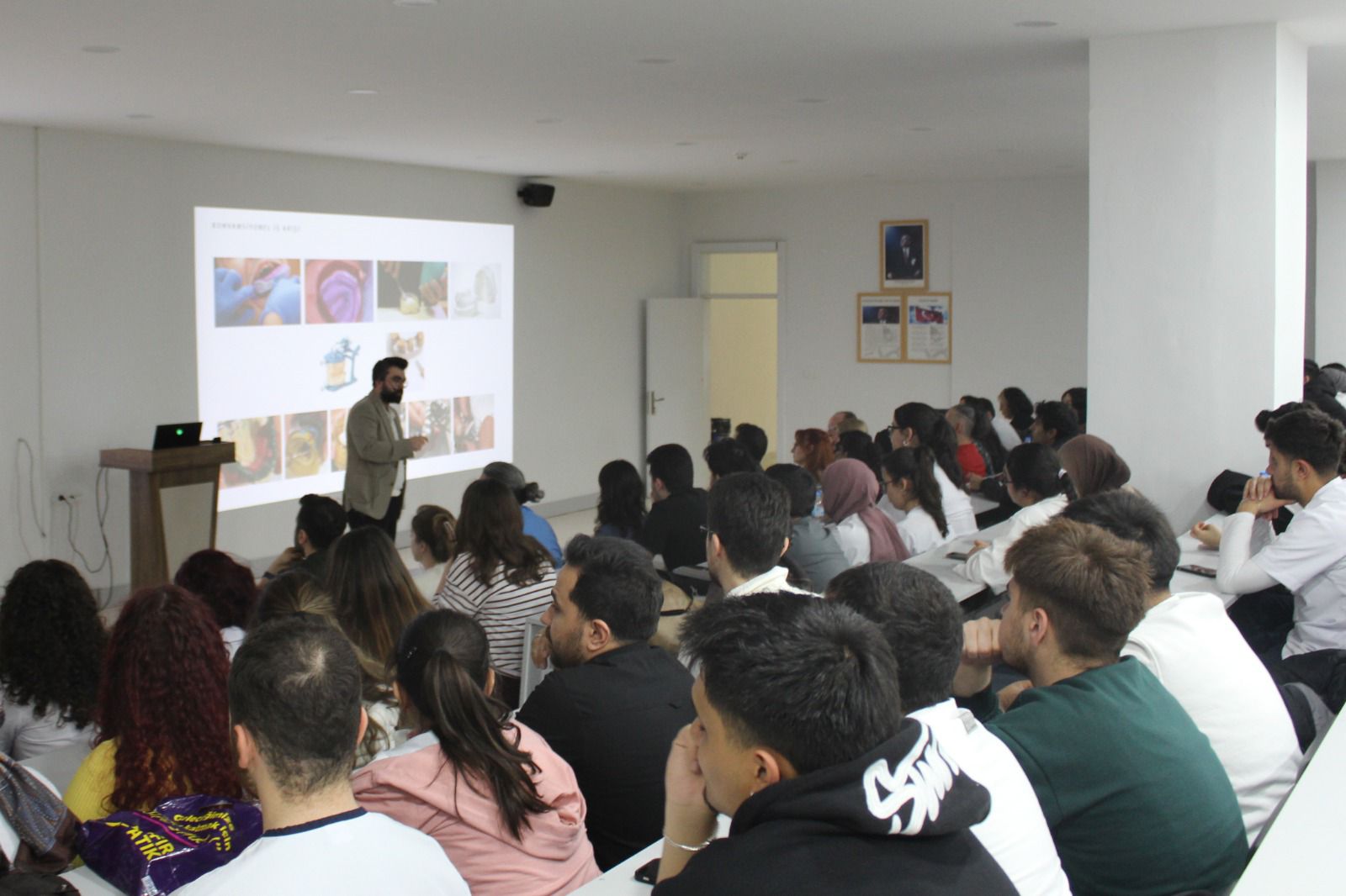 Program kapsamında görsel materyaller eşliğinde diş yapıları incelenirken, farklı klinik vakalar üzerinden uygulanabilecek tedavi yöntemleri detaylandırıldı. Restoratif uygulamalarda estetik görünüm ile fonksiyonel başarının birlikte değerlendirilmesi gerektiği belirtildi.