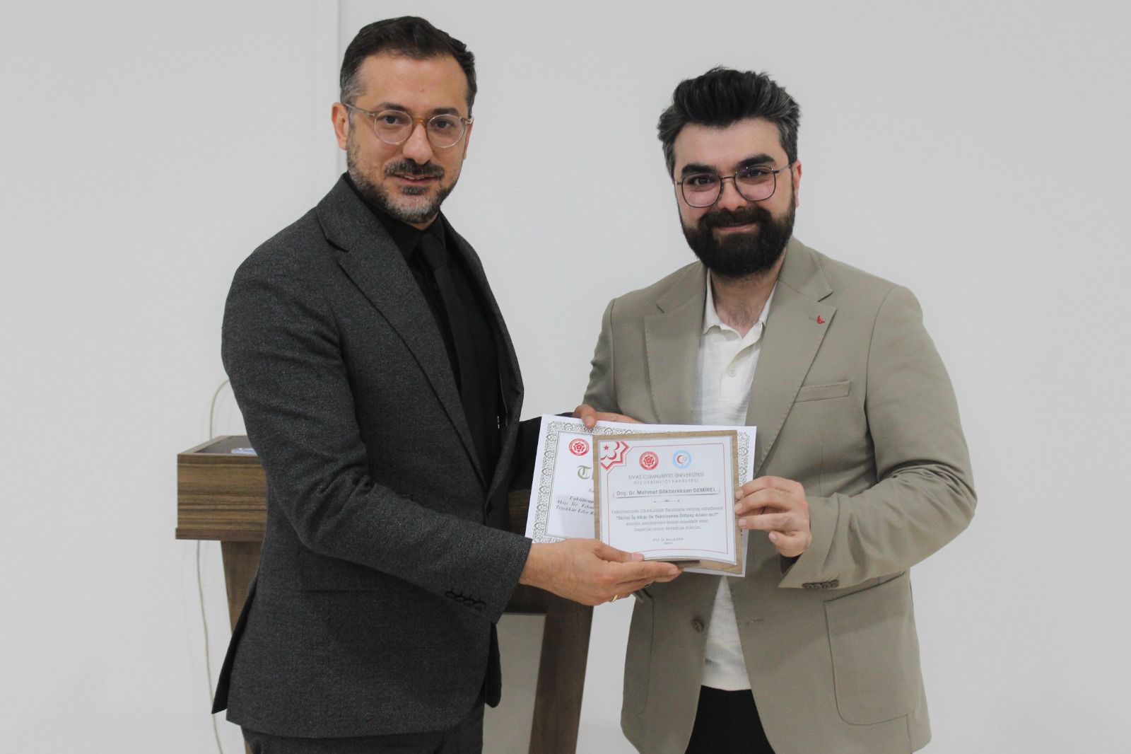 Etkinliğin sonunda Doç. Dr. Mehmet Gökberkkaan Demirel’e katkılarından dolayı, Fakülte Dekanı Prof. Dr. Recai Zan tarafından teşekkür belgesi ve plaket takdim edildi.